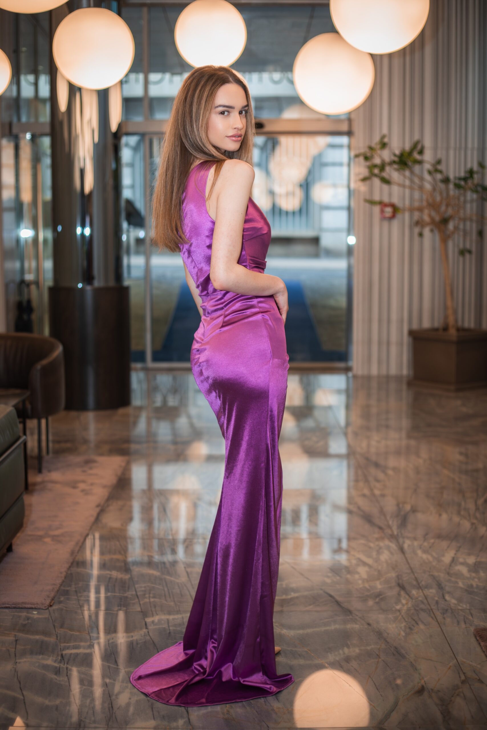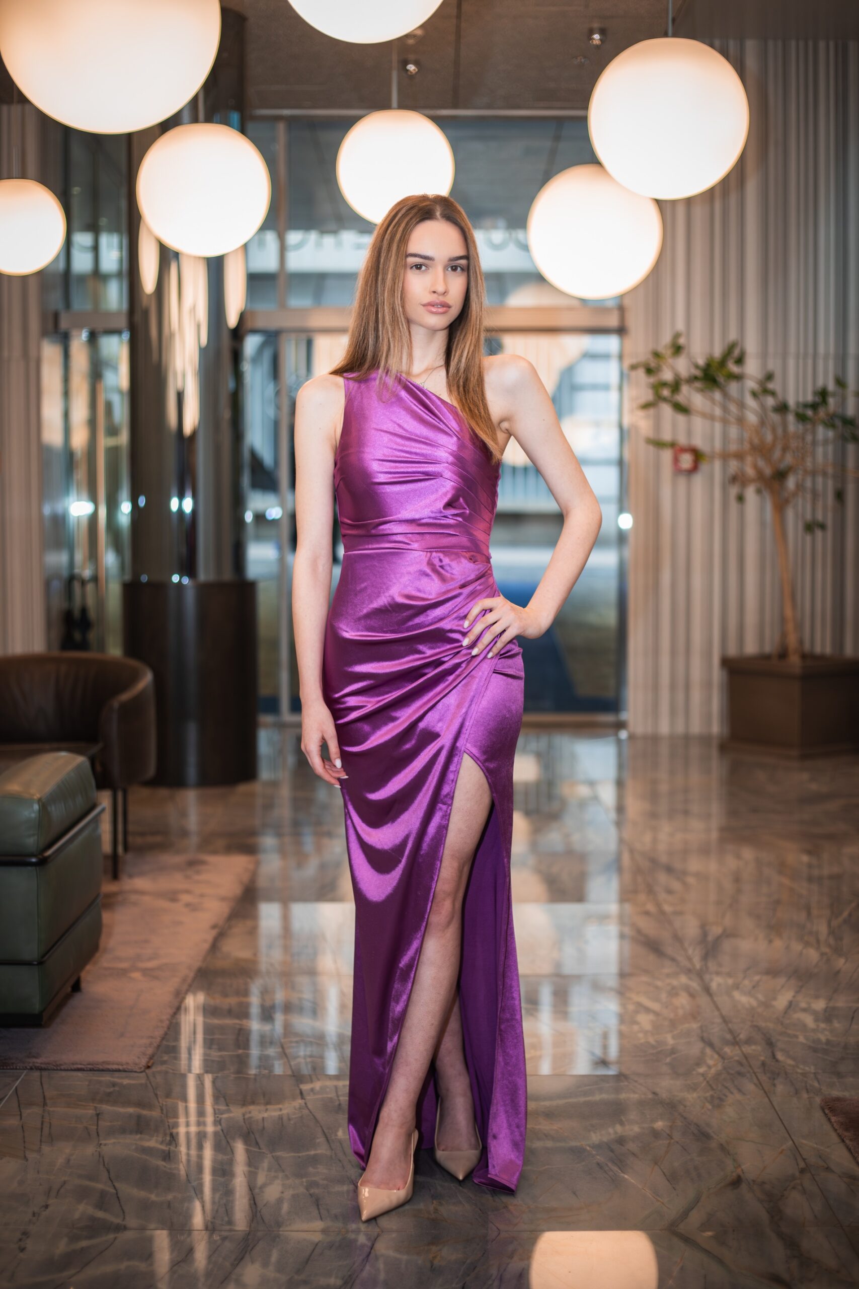 Ljubičasta haljina na jedno rame s prorezom na nozi i naborima na struku